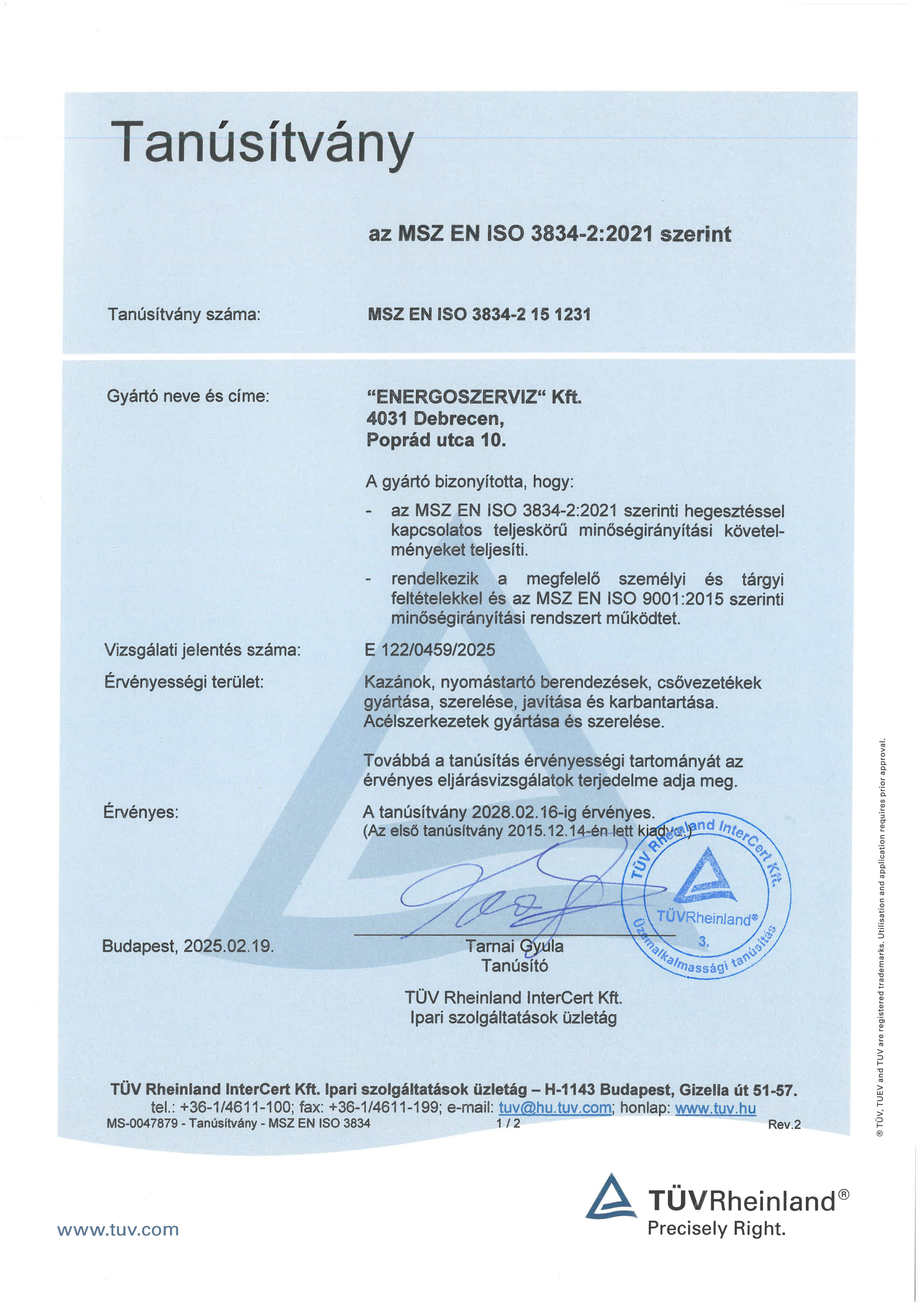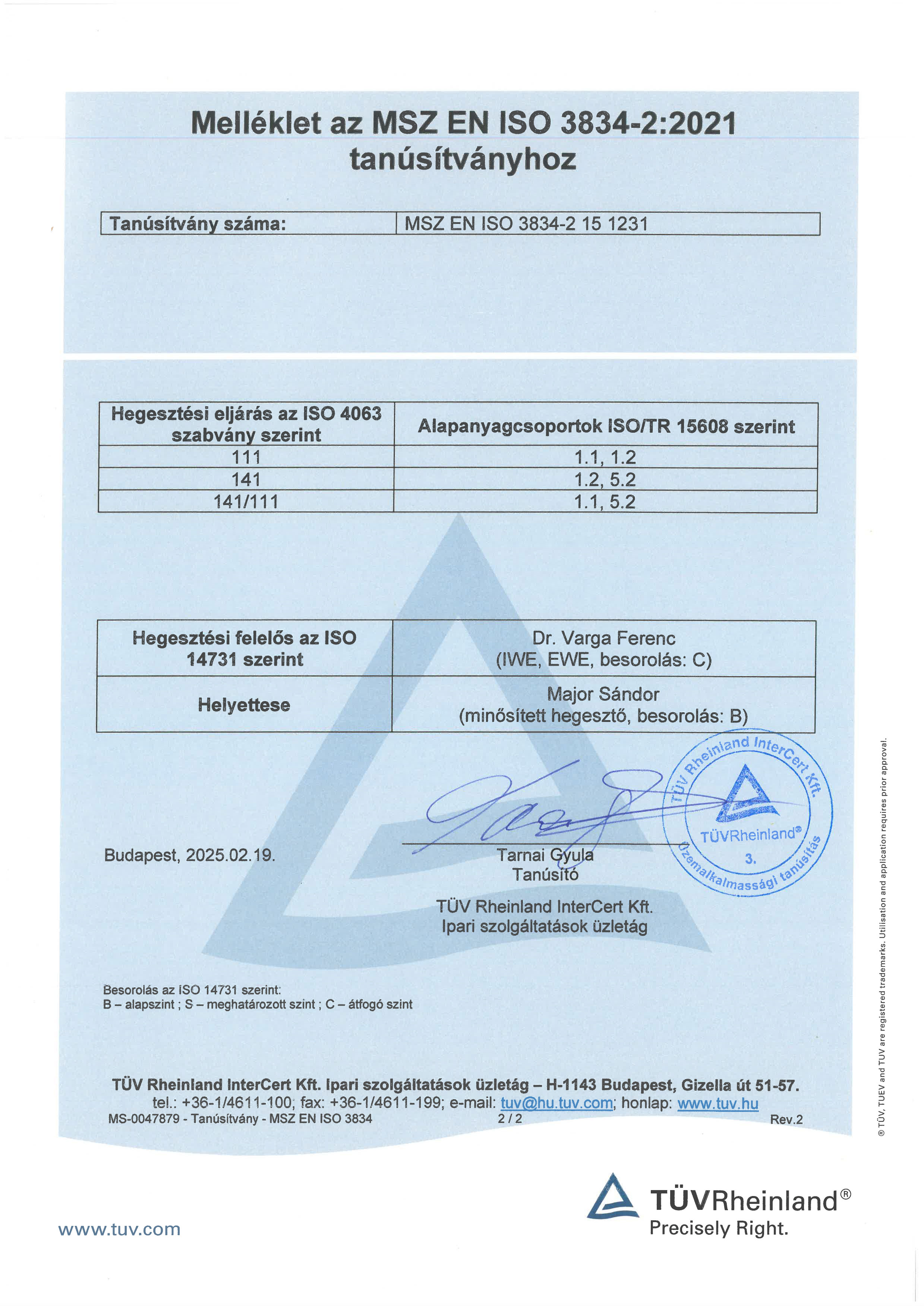 ![]() | 8/2018. ITM TANÚSÍTVÁNY/TÜVCégünk a 8/2018.(VIII.17.) ITM szerinti MSZ EN ISO 3834-2 szabvány szerinti minőségügyi követelményeknek eleget tesz és teljesíti hegesztéssel és hegesztőkkel kapcsolatos kiegészítő- illetve többletkövetelményeket | |